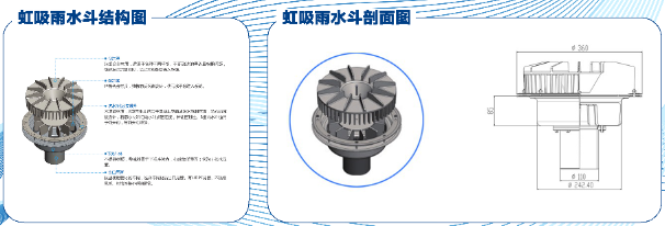 由斗體、導(dǎo)流罩、出水短管、連接壓板和整流器等組成。導(dǎo)流罩是用來攔截樹葉等固體雜物的雨水斗部件,兼有整流作用;整流器是虹吸雨水斗的重要部件,用來疏導(dǎo)水流、 消減旋流和減少空氣進(jìn)入 雨水斗出水短管;虹吸雨水斗能夠在較小的斗前水深的情況下,達(dá)到滿流狀態(tài)。我們公司開發(fā)的數(shù)十種虹吸式雨水斗專利產(chǎn)品,符合《虹吸雨水斗》CJ/T245-2007 國(guó)家標(biāo)準(zhǔn),排水量從 6L/s~120L/s,適用于各種類型的屋面。